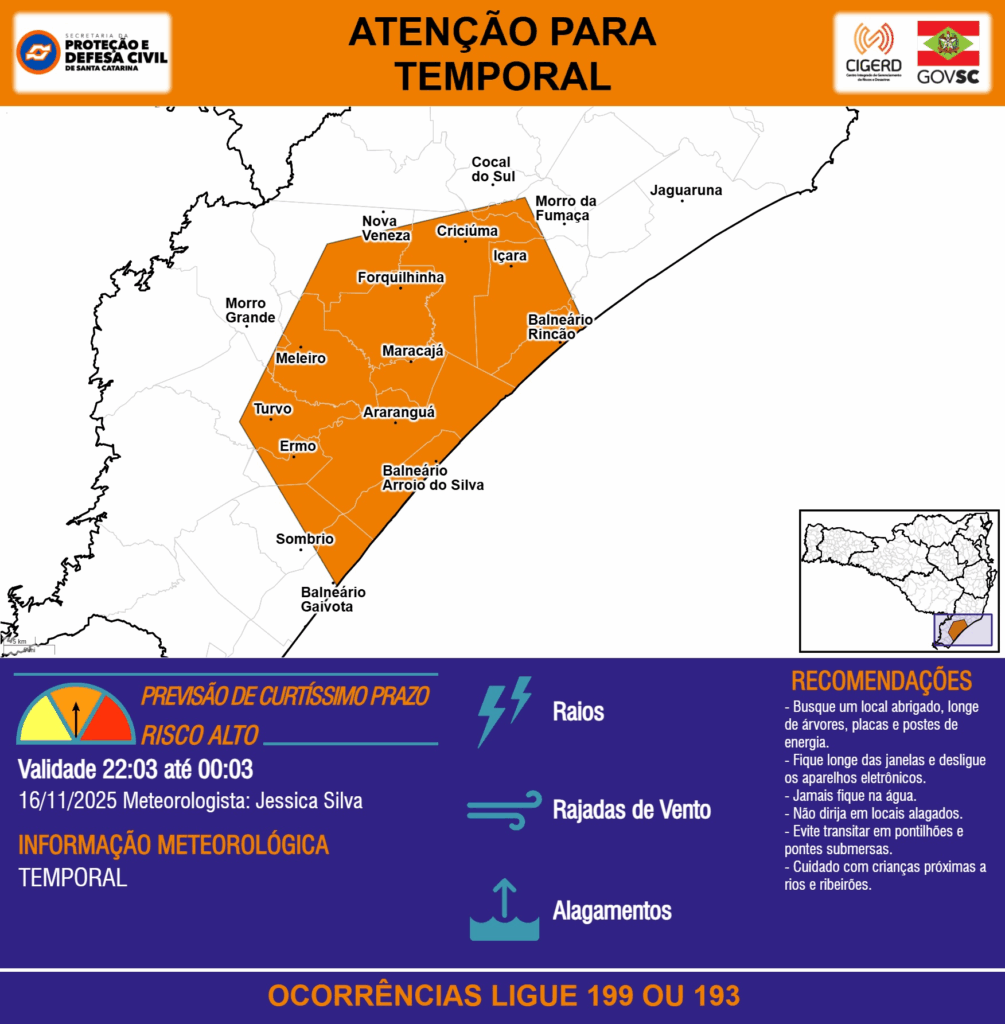 ATENÇÃO – 16/11 22:03 – TEMPORAL com RAIOS, RAJADAS DE VENTO e ALAGAMENTOS para os municípios de Araranguá, Balneário Arroio do Silva, Balneário Gaivota, Balneário Rincão, Cocal do Sul, Criciúma, Ermo, Forquilhinha, Içara, Jaguaruna, Maracajá, Meleiro, Morro Grande, Morro da Fumaça, Nova Veneza, Sombrio e Turvo nas próximas 2 horas. Ocorrências ligue 199 ou 193.