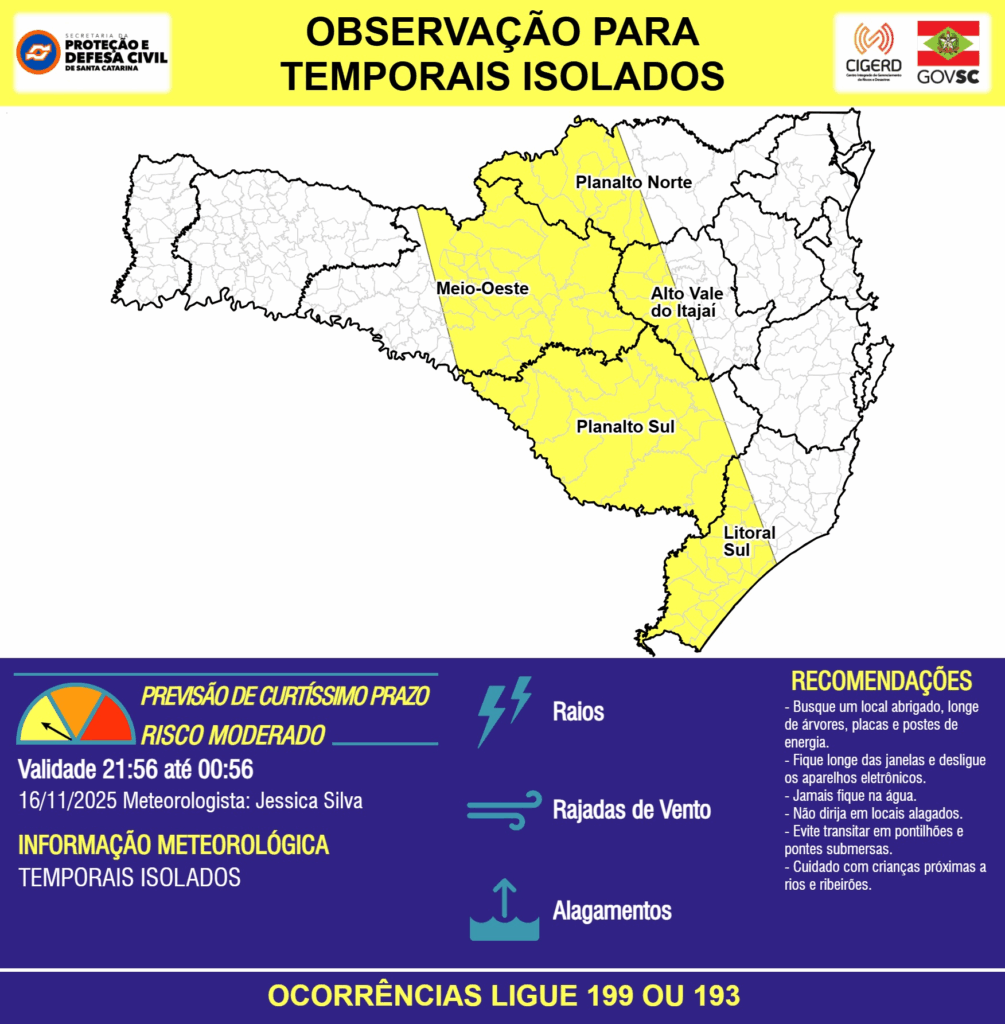 OBSERVAÇÃO – 16/11 21:56 – TEMPORAIS ISOLADOS com RAIOS, RAJADAS DE VENTO e ALAGAMENTOS pontuais para as regiões do Meio-Oeste, Planalto Norte, Planalto Sul, Litoral Sul e Alto Vale do Itajaí nas próximas 3 horas. Ocorrências ligue 199 ou 193.