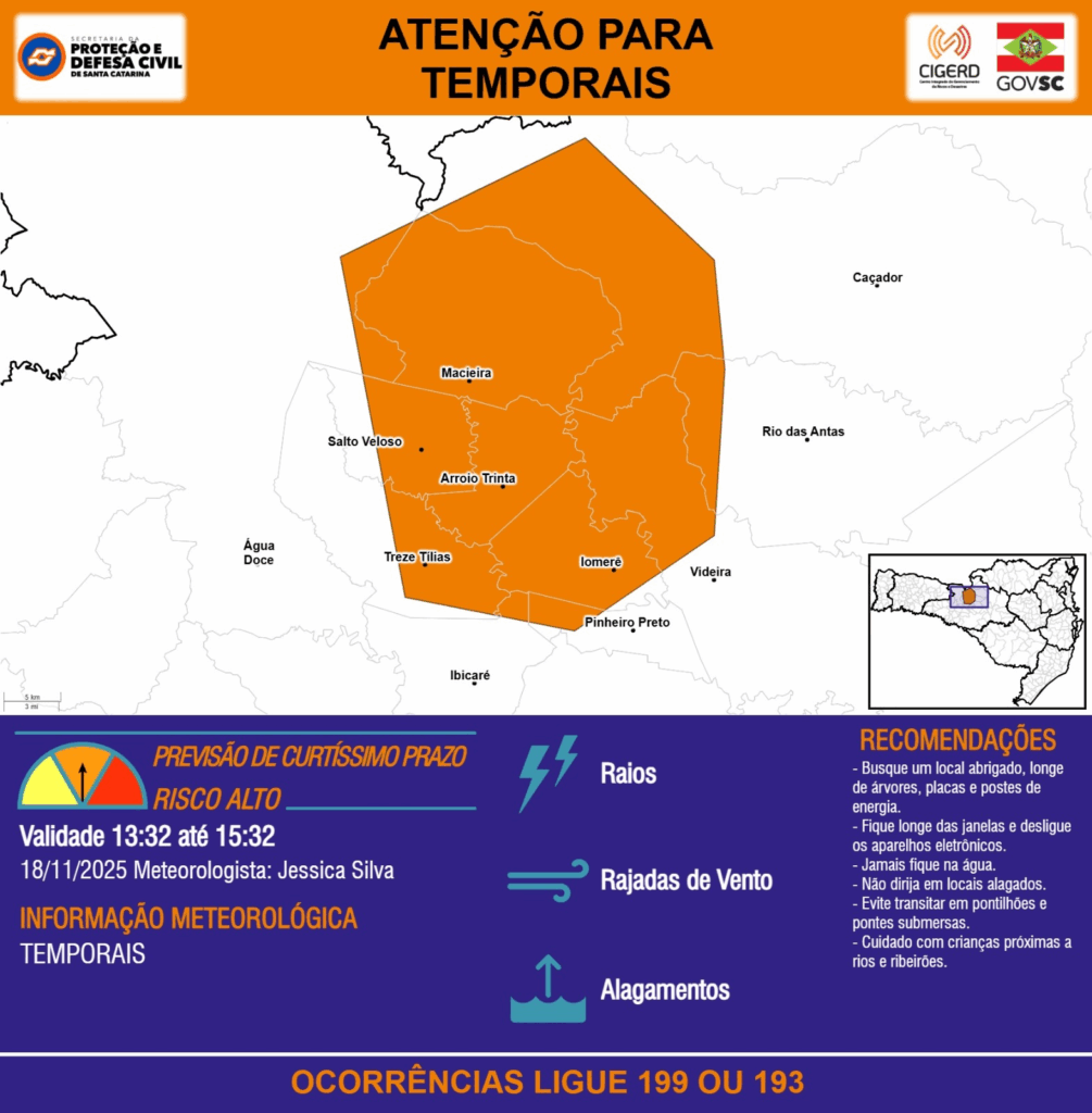 ATENÇÃO – 18/11 13:32 – TEMPORAIS com RAIOS, RAJADAS DE VENTO e ALAGAMENTOS para os municípios de Arroio Trinta, Caçador, Ibicaré, Iomerê, Macieira, Pinheiro Preto, Rio das Antas, Salto Veloso, Treze Tílias, Videira e Água Doce nas próximas 2 horas. Ocorrências ligue 199 ou 193.