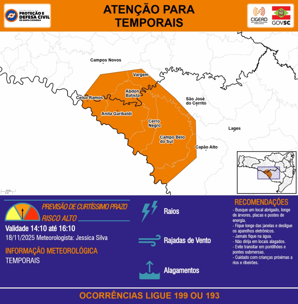 ATENÇÃO – 18/11 14:10 – TEMPORAIS com RAIOS, RAJADAS DE VENTO e ALAGAMENTOS para os municípios de Abdon Batista, Anita Garibaldi, Campo Belo do Sul, Campos Novos, Capão Alto, Celso Ramos, Cerro Negro, Lages, São José do Cerrito e Vargem nas próximas 2 horas. Ocorrências ligue 199 ou 193.