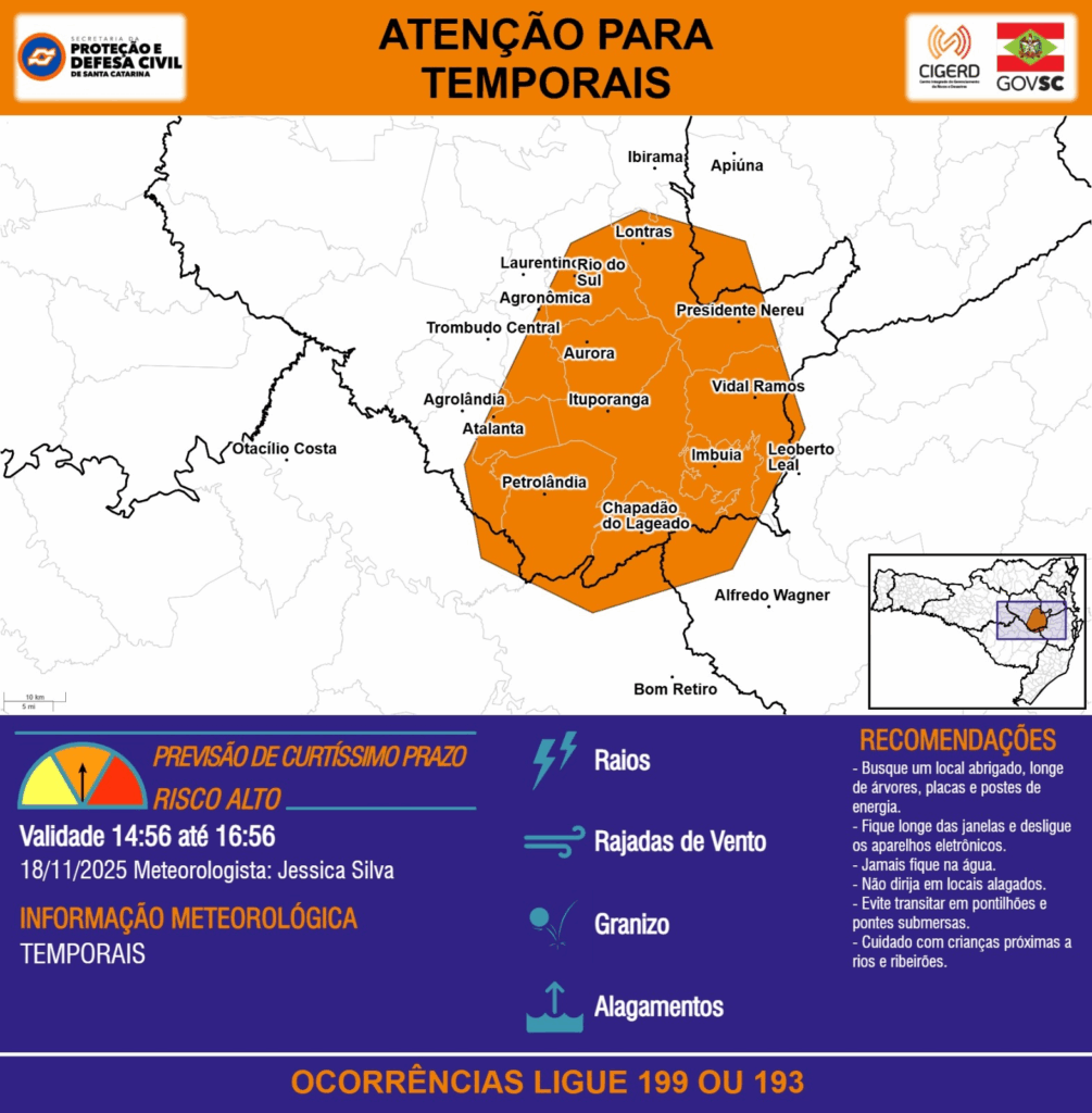 ATENÇÃO – 18/11 14:51 – TEMPORAIS com RAIOS, RAJADAS DE VENTO, GRANIZO e ALAGAMENTOS para os municípios de Araquari, Blumenau, Campo Alegre, Corupá, Garuva, Guaramirim, Jaraguá do Sul, Joinville, Massaranduba, Pomerode, Rio dos Cedros, Schroeder e São Bento do Sul nas próximas 2 horas. Ocorrências ligue 199 ou 193.