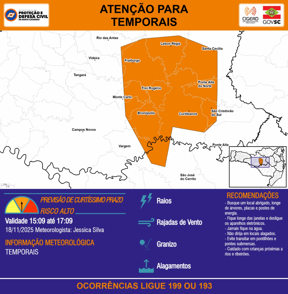 ATENÇÃO – 18/11 15:09 – TEMPORAIS com RAIOS, RAJADAS DE VENTO, GRANIZO e ALAGAMENTOS para os municípios de Brunópolis, Campos Novos, Curitibanos, Fraiburgo, Frei Rogério, Lebon Régis, Monte Carlo, Ponte Alta, Ponte Alta do Norte, Rio das Antas, Santa Cecília, São Cristóvão do Sul, São José do Cerrito, Tangará, Vargem e Videira nas próximas 2 horas. Ocorrências ligue 199 ou 193.