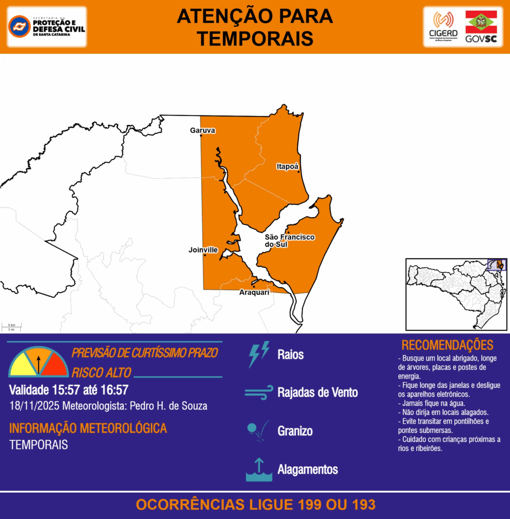 ATENÇÃO – 18/11 15:57 – TEMPORAIS com RAIOS, RAJADAS DE VENTO, GRANIZO e ALAGAMENTOS para os municípios de Araquari, Garuva, Itapoá, Joinville e São Francisco do Sul na próxima hora. Ocorrências ligue 199 ou 193.