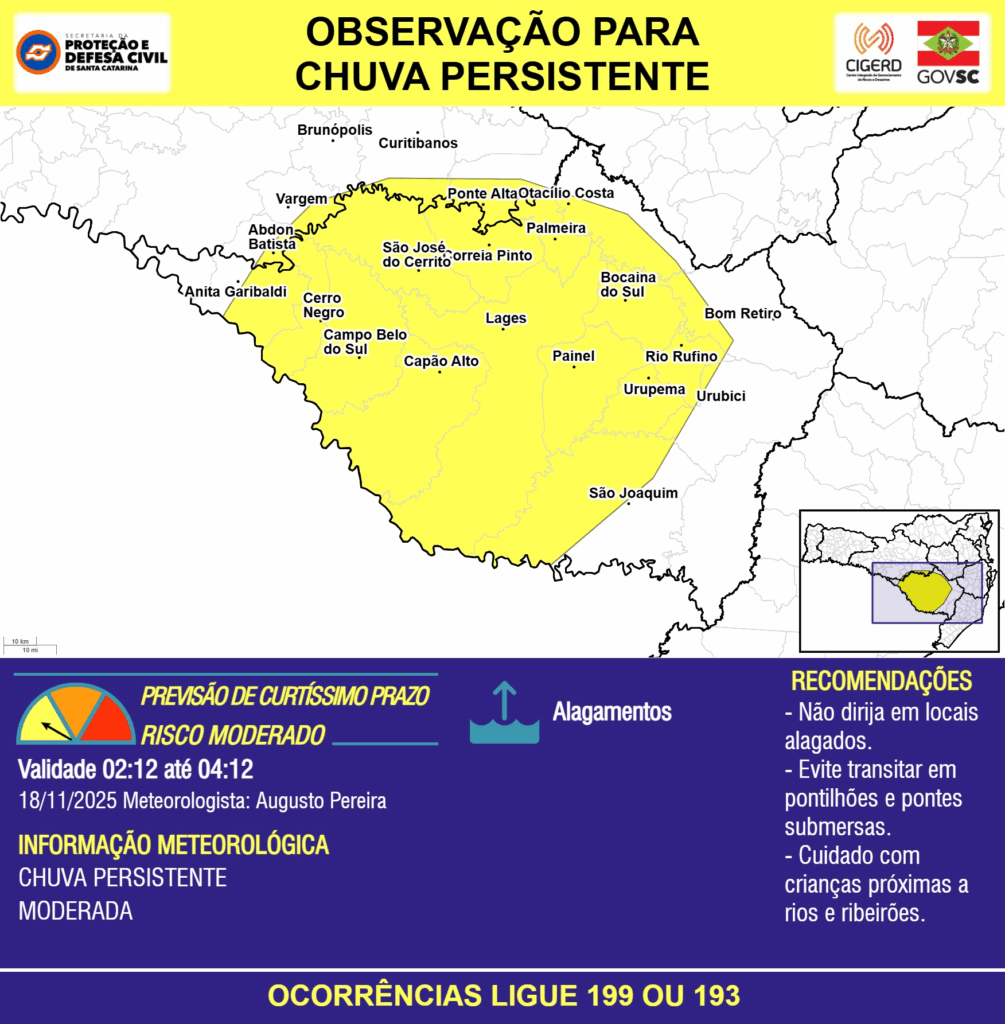 OBSERVAÇÃO – 18/11 02:12 – CHUVA PERSISTENTE de intensidade moderada com ALAGAMENTOS pontuais para os municípios de Abdon Batista, Anita Garibaldi, Bocaina do Sul, Bom Retiro, Brunópolis, Campo Belo do Sul, Capão Alto, Cerro Negro, Correia Pinto, Curitibanos, Lages, Otacílio Costa, Painel, Palmeira, Ponte Alta, Rio Rufino, São Joaquim, São José do Cerrito, Urubici, Urupema e Vargem nas próximas 2 horas. Ocorrências ligue 199 ou 193.