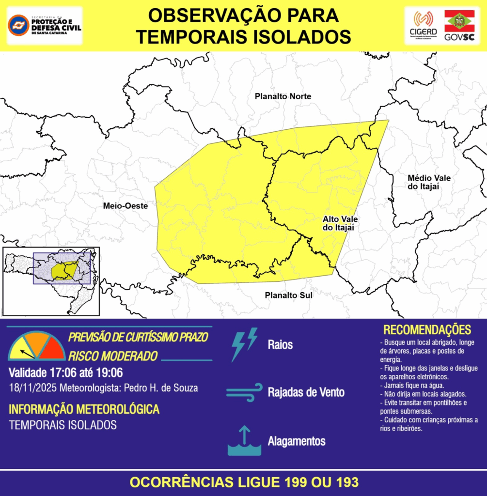 OBSERVAÇÃO – 18/11 17:06 – TEMPORAIS ISOLADOS com RAIOS, RAJADAS DE VENTO e ALAGAMENTOS pontuais para as regiões do Meio-Oeste, Planalto Norte, Planalto Sul, Médio e Alto Vale do Itajaí nas próximas 2 horas. Ocorrências ligue 199 ou 193.