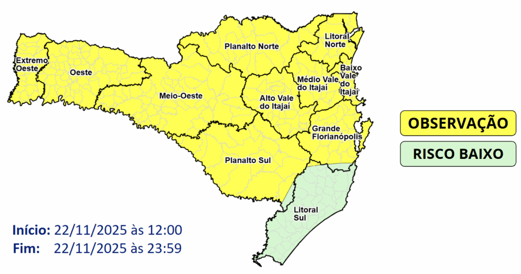 Entre a tarde e noite deste sábado (22), uma área de baixa pressão somada ao calor e transporte de umidade, favorece condições para temporais acompanhados de raios, rajadas de vento, chuva pontualmente intensa e queda de granizo em grande parte de Santa Catarina. O risco é baixo a moderado para ocorrências relacionadas a destelhamentos, danos na rede elétrica, queda de galhos e árvores, além de alagamentos pontuais.