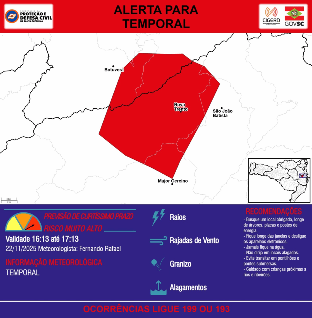 ALERTA – 22/11 16:13 – TEMPORAL com RAIOS, RAJADAS DE VENTO, GRANIZO e ALAGAMENTOS para os municípios de Botuverá, Brusque, Guabiruba, Major Gercino, Nova Trento e São João Batista na próxima hora. Ocorrências ligue 199 ou 193.