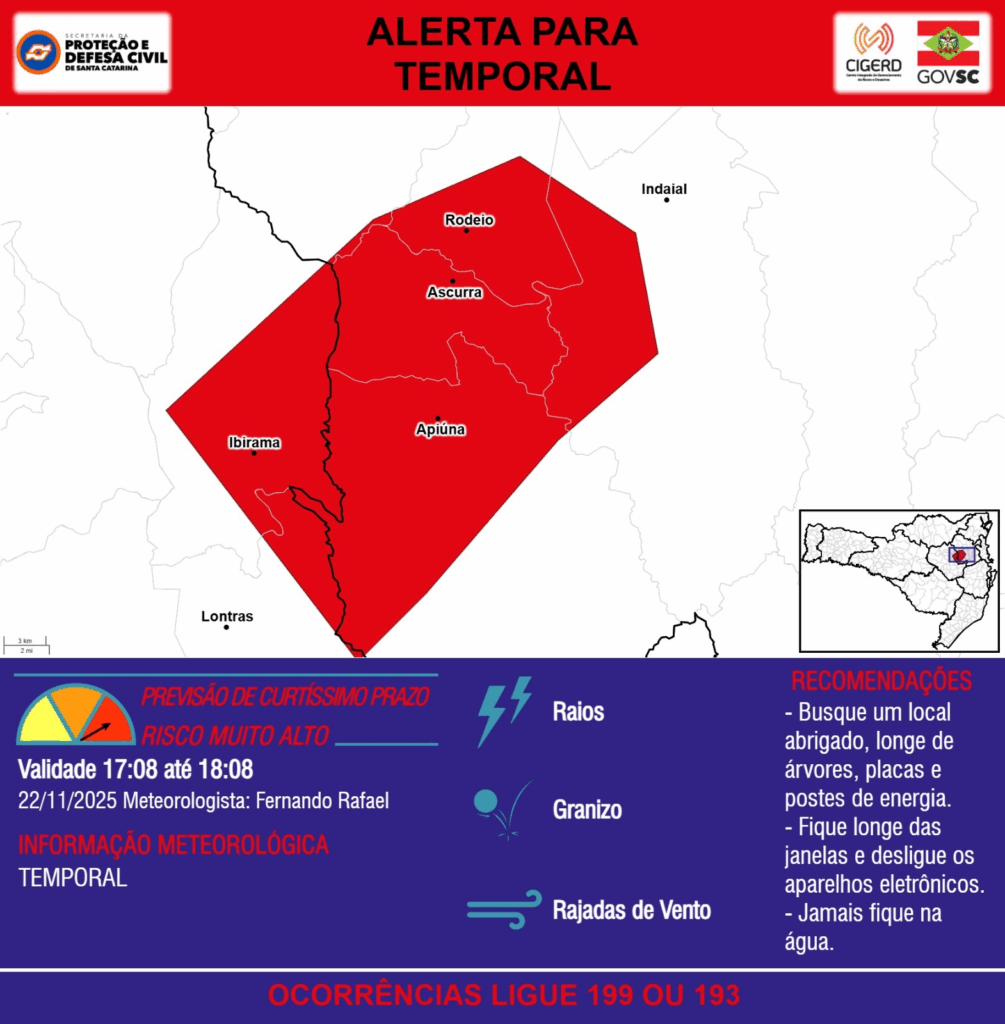 ALERTA – 22/11 17:08 – TEMPORAL com RAIOS, GRANIZO e RAJADAS DE VENTO para os municípios de Apiúna, Ascurra, Benedito Novo, Ibirama, Indaial, Lontras e Rodeio na próxima hora. Ocorrências ligue 199 ou 193.