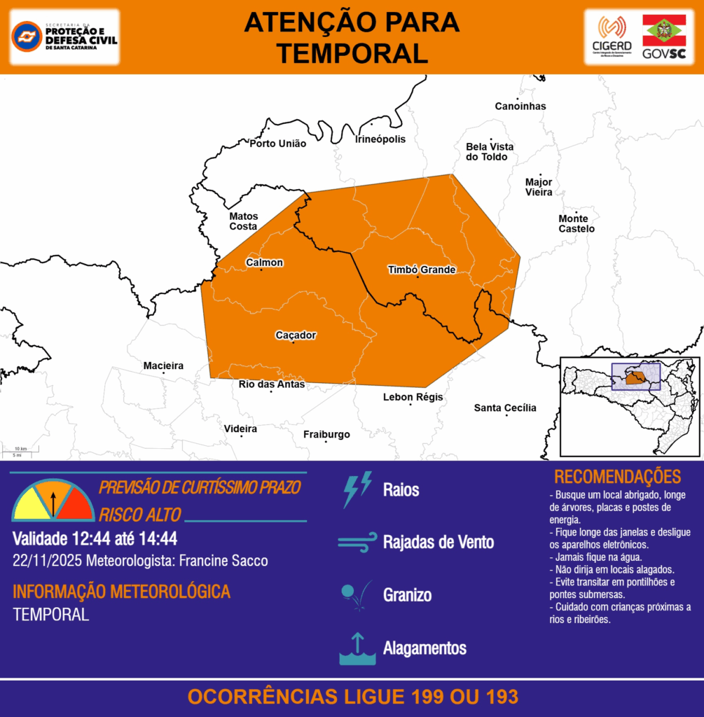 ATENÇÃO – 22/11 12:44 – TEMPORAL com RAIOS, RAJADAS DE VENTO, GRANIZO e ALAGAMENTOS para as regiões do Meio-Oeste e Planalto Norte nas próximas 2 horas. Ocorrências ligue 199 ou 193.