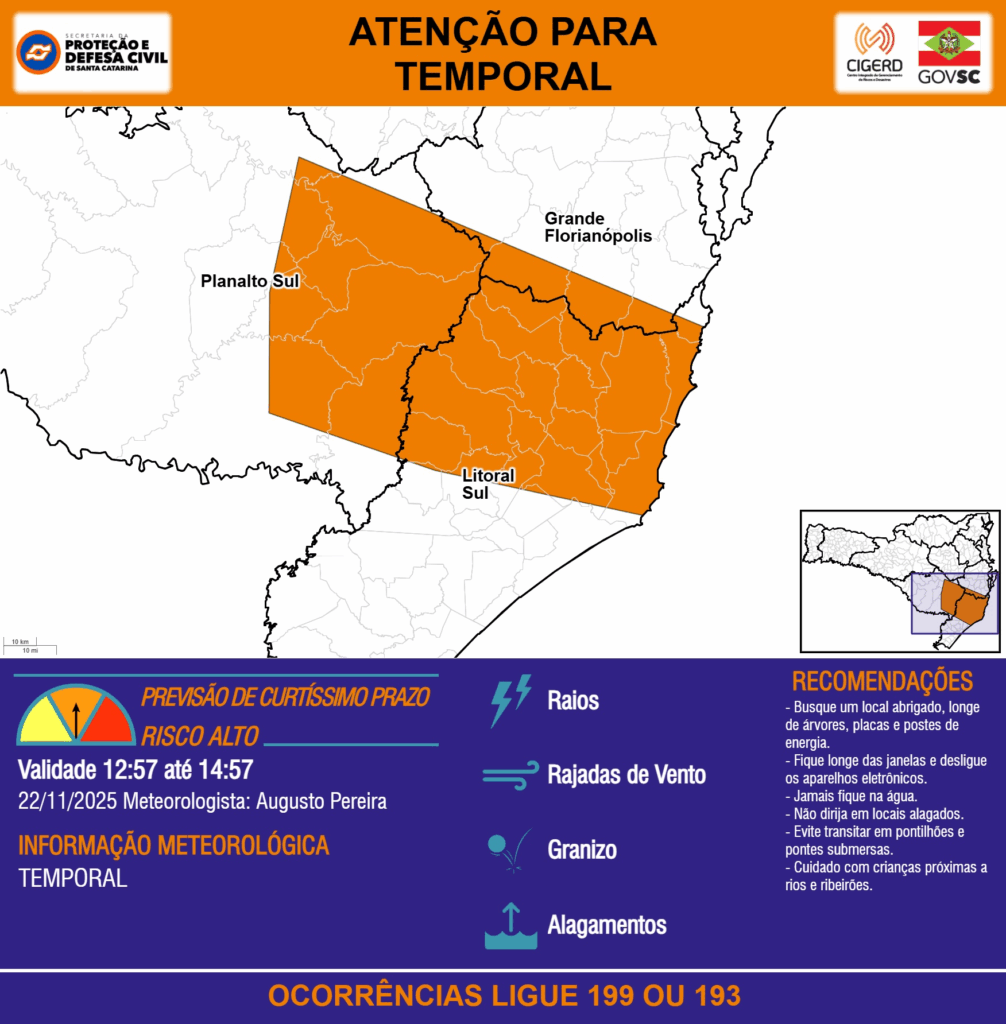 ATENÇÃO – 22/11 12:57 – TEMPORAL com RAIOS, RAJADAS DE VENTO, GRANIZO e ALAGAMENTOS para as regiões do Planalto Sul, Litoral Sul e Grande Florianópolis nas próximas 2 horas. Ocorrências ligue 199 ou 193.