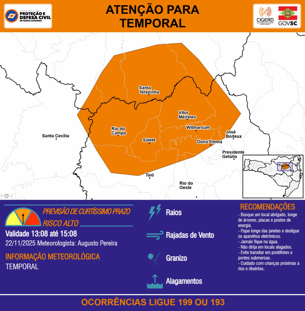 ATENÇÃO – 22/11 13:08 – TEMPORAL com RAIOS, RAJADAS DE VENTO, GRANIZO e ALAGAMENTOS para as regiões do Meio-Oeste, Planalto Norte e Alto Vale do Itajaí nas próximas 2 horas. Ocorrências ligue 199 ou 193.