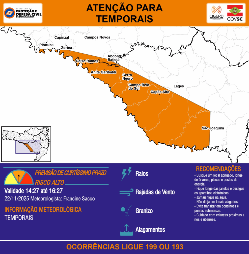 ATENÇÃO – 22/11 14:27 – TEMPORAIS com RAIOS, RAJADAS DE VENTO, GRANIZO e ALAGAMENTOS para as regiões do Meio-Oeste e Planalto Sul nas próximas 2 horas. Ocorrências ligue 199 ou 193.