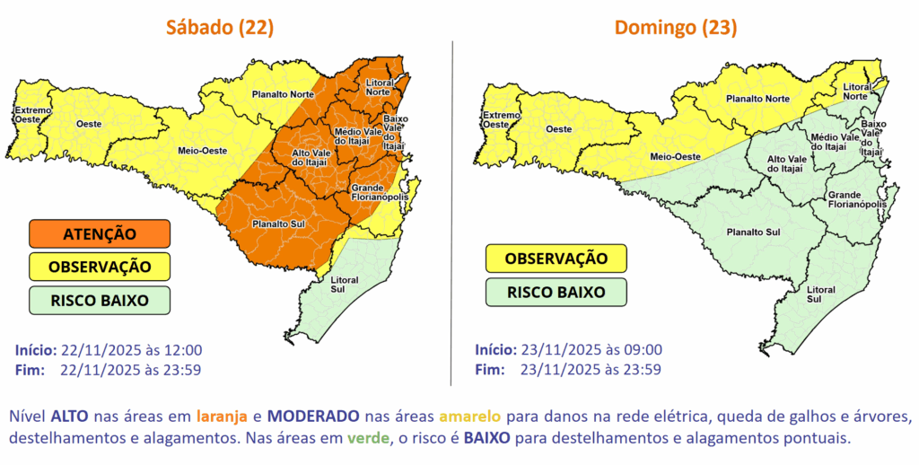 As instabilidades começam a se formar já no início da tarde do sábado (22), no Grande Oeste e nas áreas próximas ao Rio Grande do Sul, avançando para as demais regiões até o final da tarde. Destaca-se, ainda, que os temporais mais intensos são esperados no Vale do Itajaí, Grande Florianópolis Serrana, Planalto Sul, partes do Planalto Norte e Litoral Norte.