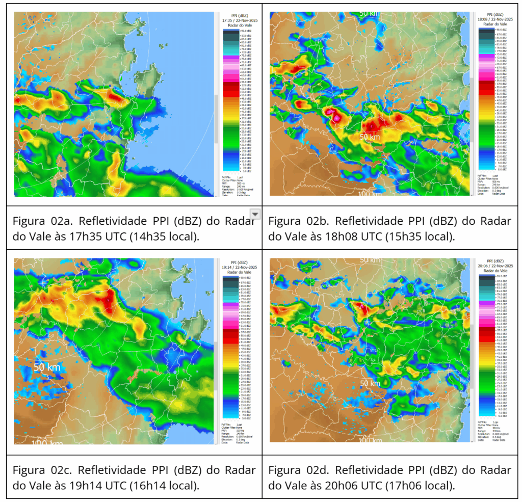 As análises do Radar Meteorológico do Vale (Figura 02) mostraram valores altos de refletividade (>55/60 dBZ) em vários municípios, como em São José (Figura 02a), Petrolândia (Figura 02b), Nova Trento (Figura 02c) e entre Rio do Sul, Lontras e Apiúna (Figura 02d). Esses valores vão de encontro a ocorrência de granizo em meio a chuva intensa, que foram observados nessas regiões.