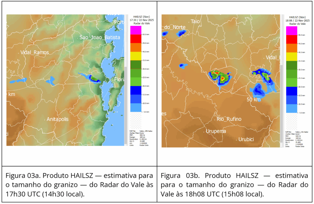 Destaca-se à estimativa de granizo (Figura 03), principalmente para São José (Figura 03a) onde foi identificado valores aproximados de 3 cm e Petrolândia (Figura 3b) com valores próximos dos 5 cm.