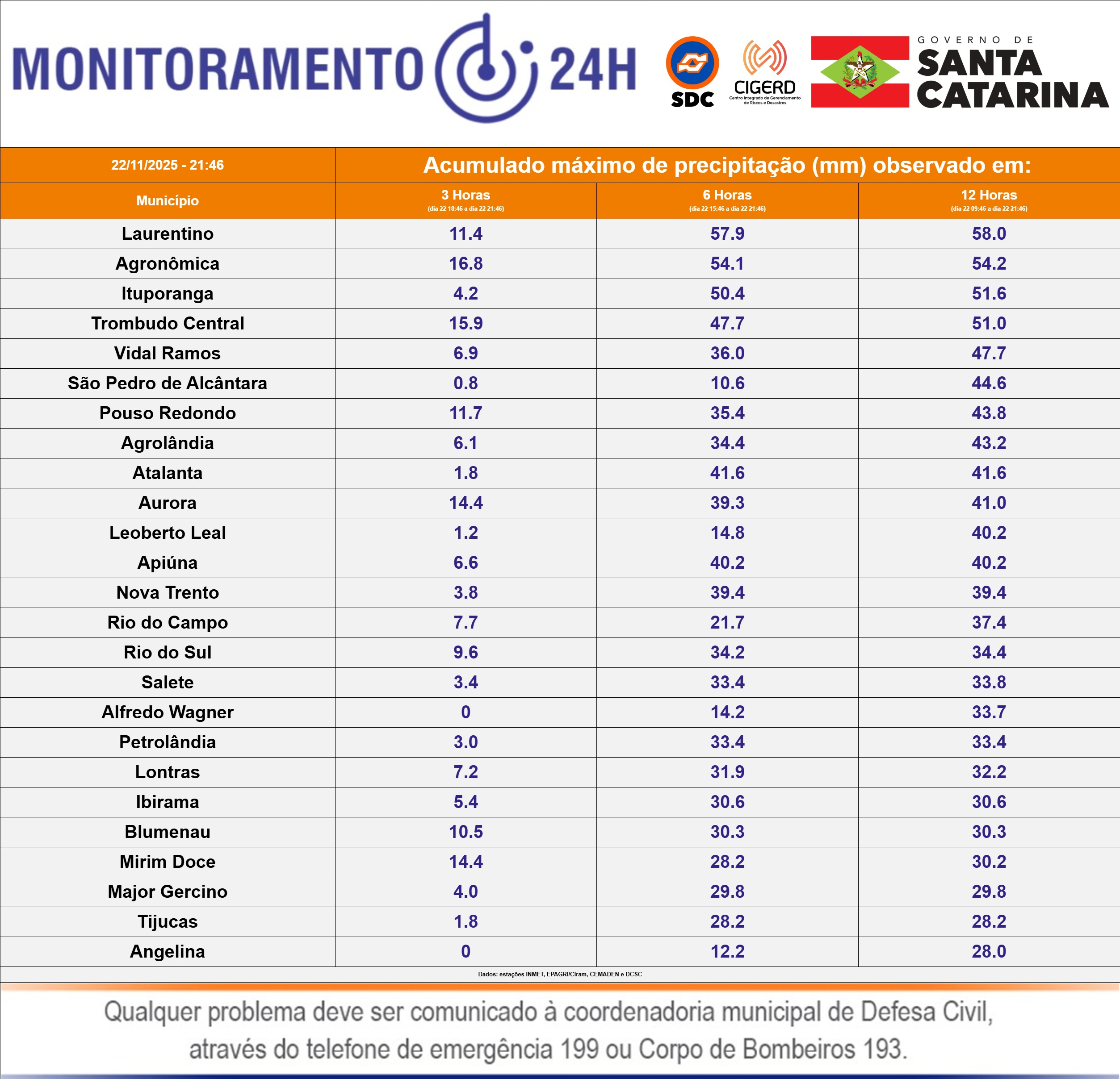 Os maiores acumulados de chuva foram registrados entre o Vale do Itajaí e a Grd. Florianópolis, com destaque para os municípios de Laurentino (58 mm), Agronômica (54,2 mm), Ituporanga (51,6 mm) e Trombudo Central (51,0 mm). A Tabela 1 apresenta os maiores acumulados para os intervalos de três, seis e doze horas registradas pela rede hidrometeorológica oficial.