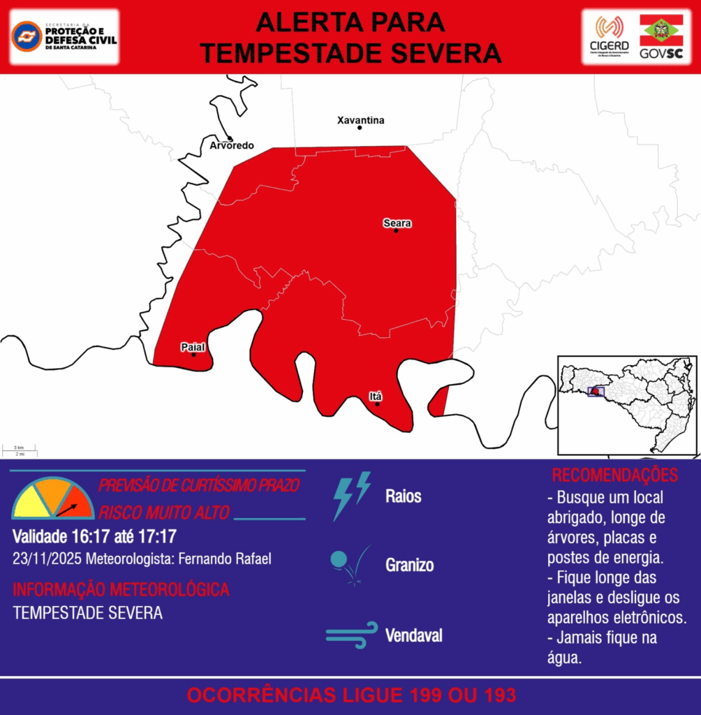ALERTA – 23/11 16:17 – TEMPESTADE SEVERA com RAIOS, GRANIZO e VENDAVAL para os municípios de Arvoredo, Itá, Paial, Seara, Xavantina e Xaxim na próxima hora. Ocorrências ligue 199 ou 193.
