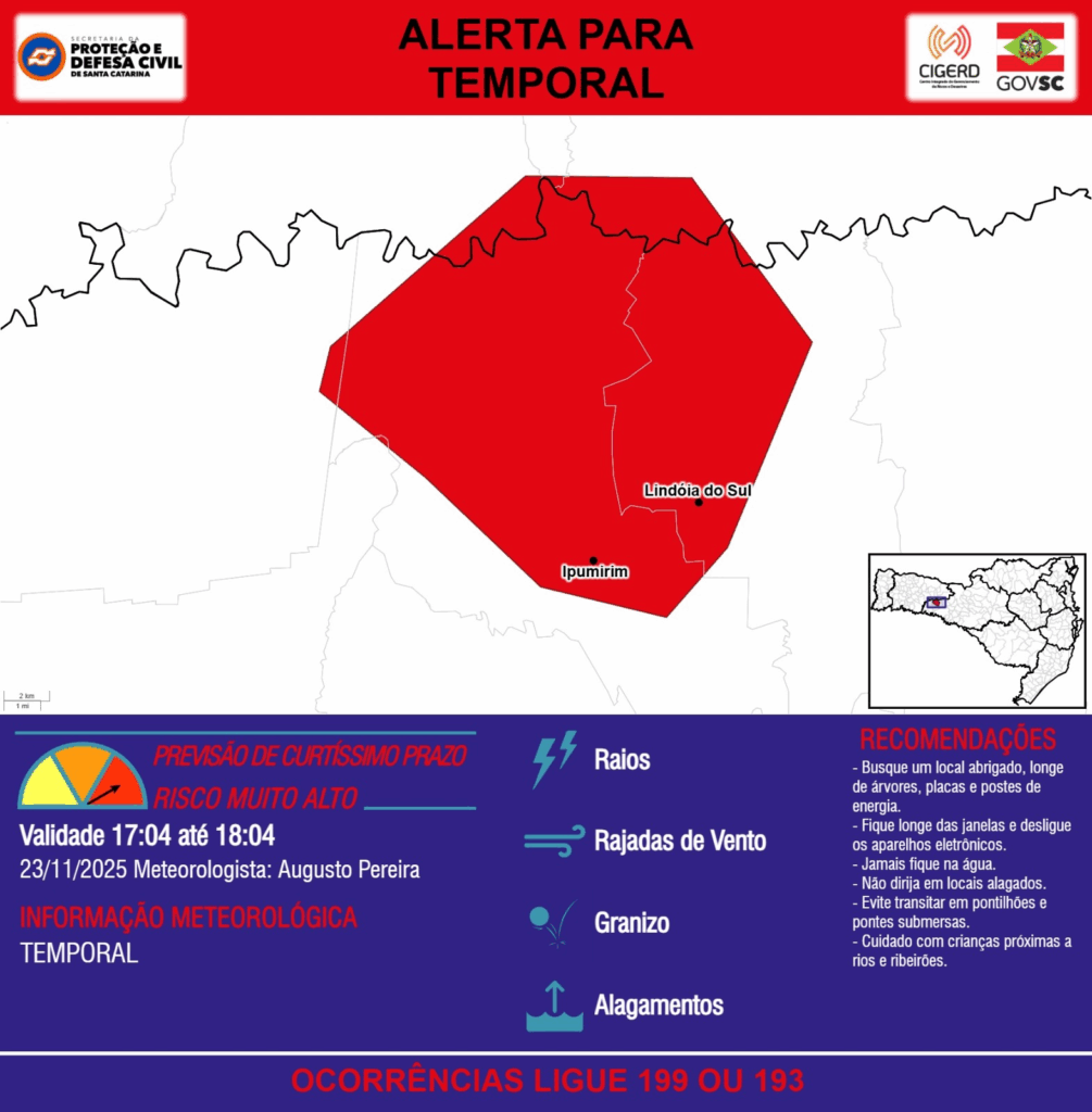 ALERTA – 23/11 17:04 – TEMPORAL com RAIOS, RAJADAS DE VENTO, GRANIZO e ALAGAMENTOS para a região do Meio-Oeste na próxima hora. Ocorrências ligue 199 ou 193.