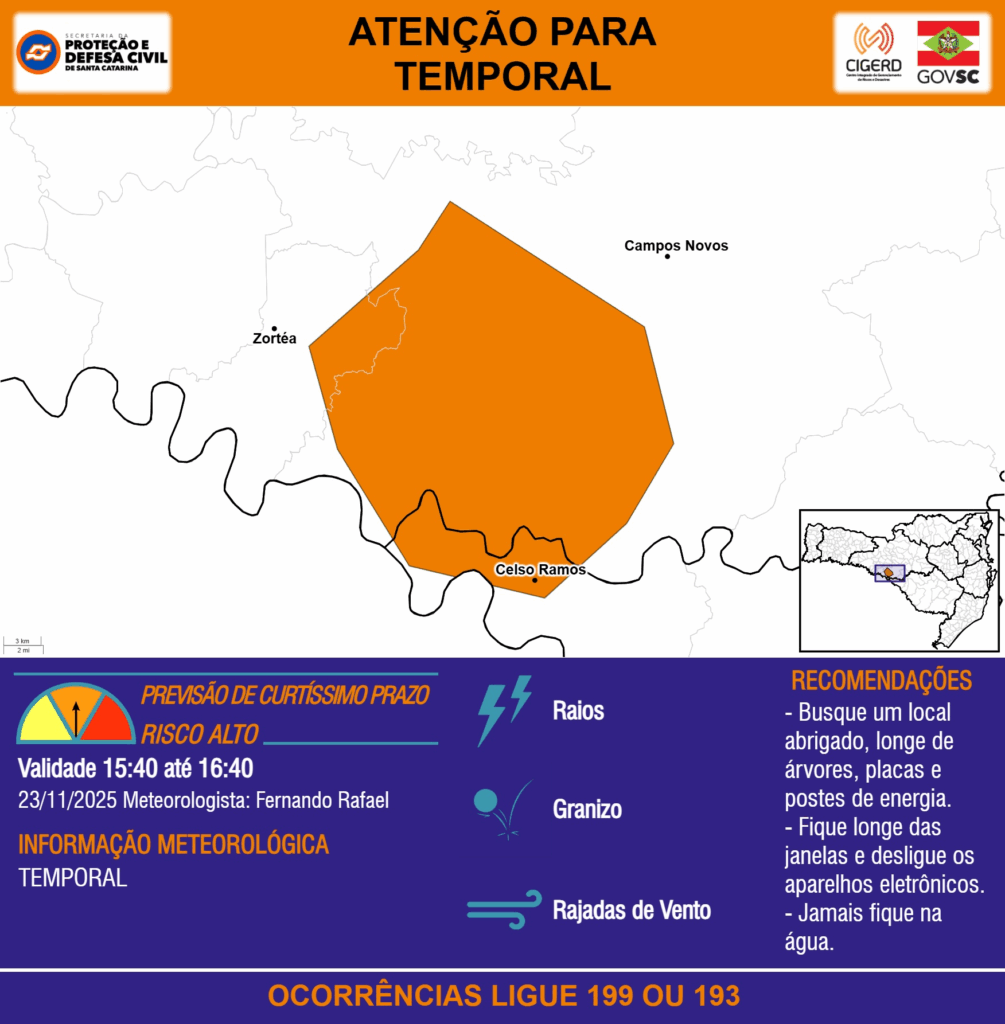 ATENÇÃO – 23/11 15:40 – TEMPORAL com RAIOS, GRANIZO e RAJADAS DE VENTO para os municípios de Campos Novos, Celso Ramos e Zortéa na próxima hora. Ocorrências ligue 199 ou 193.