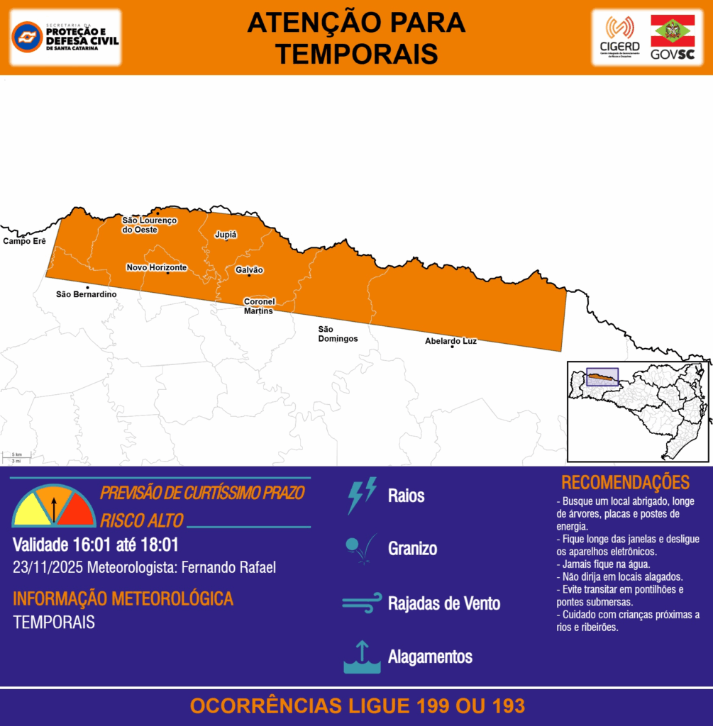 ATENÇÃO – 23/11 16:01 – TEMPORAIS com RAIOS, GRANIZO, RAJADAS DE VENTO e ALAGAMENTOS para os municípios de Abelardo Luz, Campo Erê, Coronel Martins, Galvão, Jupiá, Novo Horizonte, São Bernardino, São Domingos e São Lourenço do Oeste nas próximas 2 horas. Ocorrências ligue 199 ou 193.