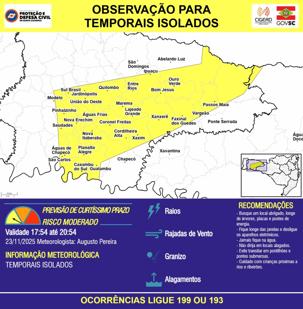 OBSERVAÇÃO – 23/11 17:54 – TEMPORAIS ISOLADOS com RAIOS, RAJADAS DE VENTO, GRANIZO e ALAGAMENTOS pontuais para os municípios de Abelardo Luz, Bom Jesus, Caxambu do Sul, Chapecó, Cordilheira Alta, Coronel Freitas, Entre Rios, Faxinal dos Guedes, Guatambu, Ipuaçu, Jardinópolis, Lajeado Grande, Marema, Modelo, Nova Erechim, Nova Itaberaba, Ouro Verde, Passos Maia, Pinhalzinho, Planalto Alegre, Ponte Serrada, Quilombo, Saudades, Sul Brasil, São Carlos, São Domingos, União do Oeste, Vargeão, Xanxerê, Xavantina, Xaxim, Água Doce, Águas Frias e Águas de Chapecó nas próximas 3 horas. Ocorrências ligue 199 ou 193.