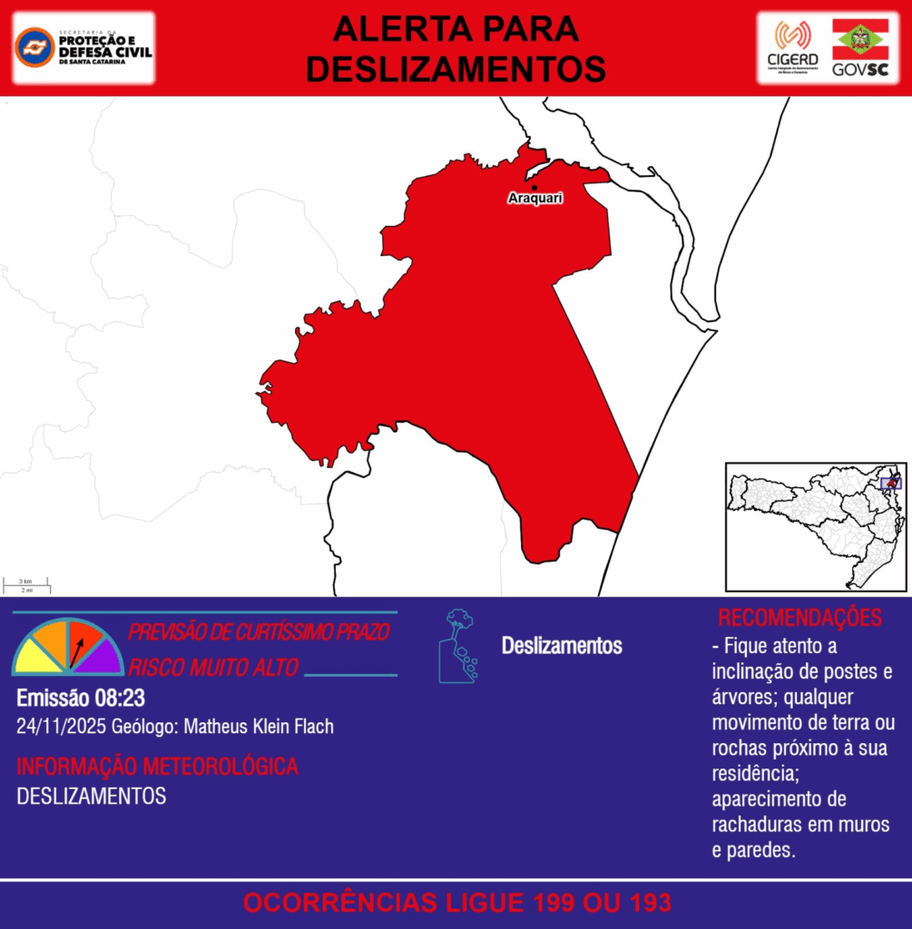 ALERTA – 24/11 08:23 – DESLIZAMENTOS para o município de Araquari