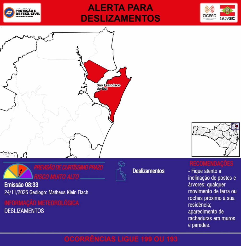 ALERTA – 24/11 08:33 – DESLIZAMENTOS para o município de São Francisco do Sul. Ocorrências ligue 199 ou 193