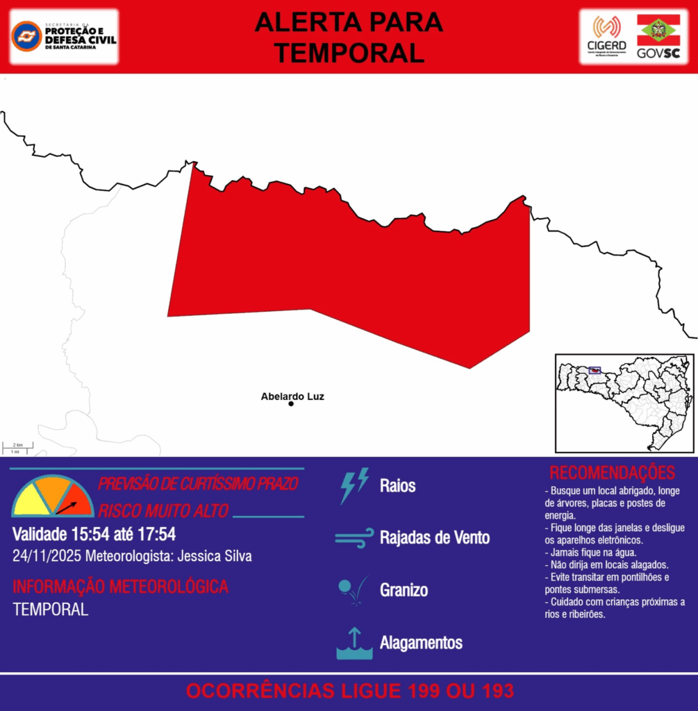 ALERTA – 24/11 15:54 – TEMPORAL com RAIOS, RAJADAS DE VENTO, GRANIZO e ALAGAMENTOS para o município de Abelardo Luz nas próximas 2 horas. Ocorrências ligue 199 ou 193.