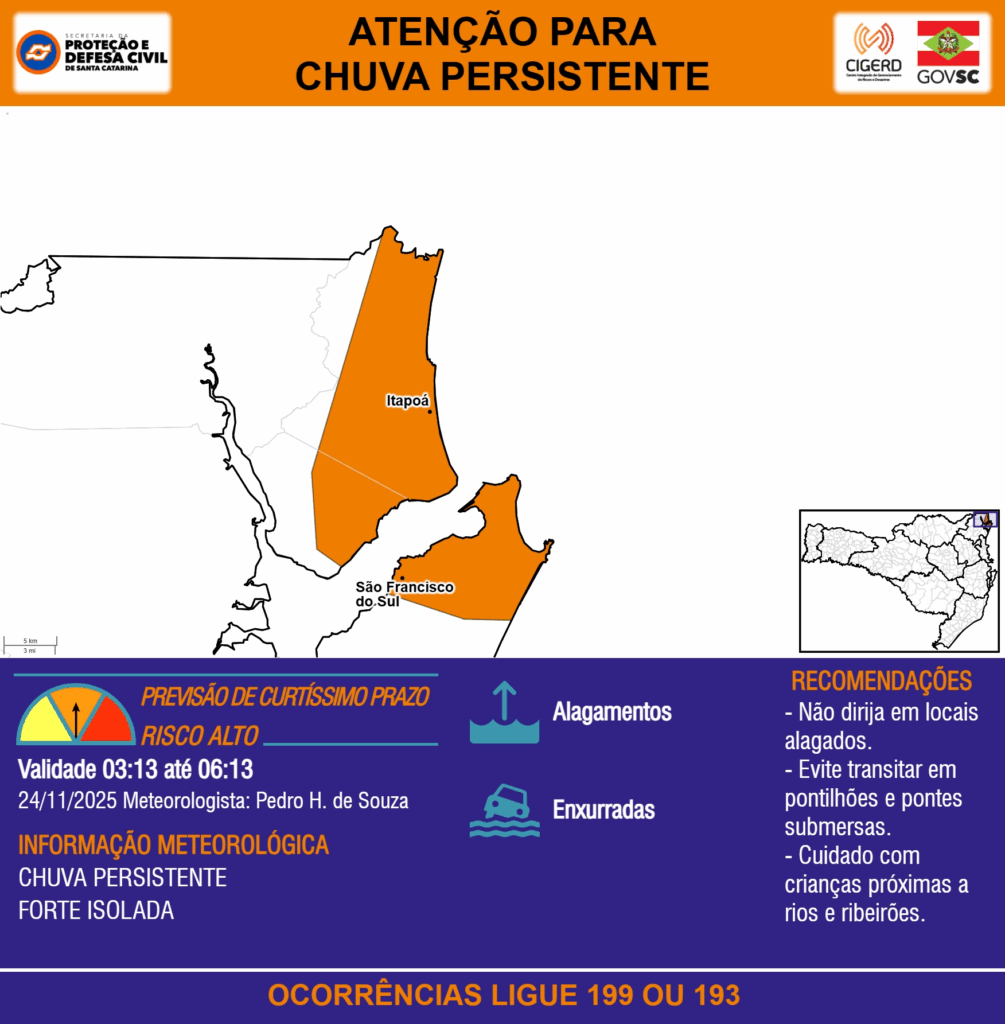 ATENÇÃO – 24/11 03:13 – CHUVA PERSISTENTE de intensidade forte isolada com ALAGAMENTOS e risco de ENXURRADAS para os municípios de Itapoá e São Francisco do Sul nas próximas 3 horas. Ocorrências ligue 199 ou 193.