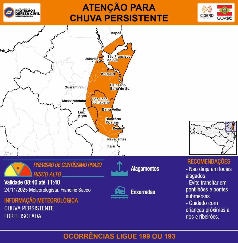 ATENÇÃO – 24/11 08:40 – CHUVA PERSISTENTE de intensidade forte isolada com ALAGAMENTOS e risco de ENXURRADAS para as regiões do Litoral Norte, Baixo e Médio Vale do Itajaí nas próximas 3 horas. Ocorrências ligue 199 ou 193..