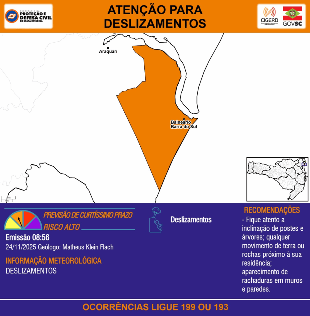 ATENÇÃO – 24/11 08:56 – DESLIZAMENTOS para o município de Balneário Barra do Sul. Ocorrências ligue 199 ou 193.