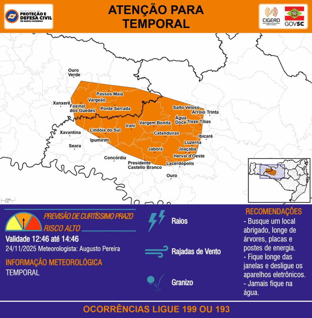 ATENÇÃO – 24/11 12:46 – TEMPORAL com RAIOS, RAJADAS DE VENTO e GRANIZO para as regiões do Oeste e Meio-Oeste nas próximas 2 horas. Ocorrências ligue 199 ou 193.