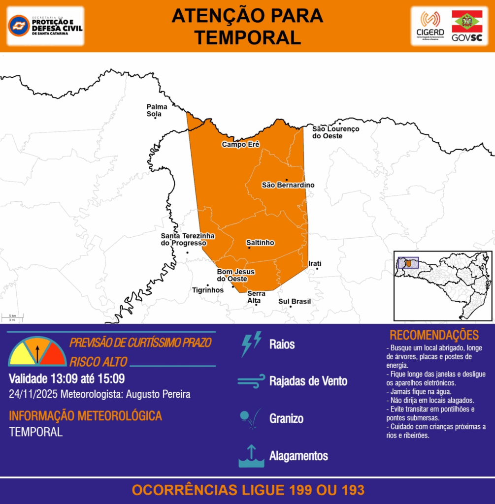 ATENÇÃO – 24/11 13:09 – TEMPORAL com RAIOS, RAJADAS DE VENTO, GRANIZO e ALAGAMENTOS para as regiões do Extremo Oeste e Oeste nas próximas 2 horas. Ocorrências ligue 199 ou 193.