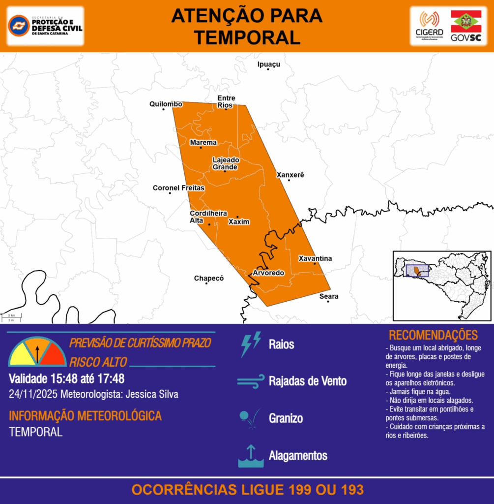 ATENÇÃO – 24/11 15:48 – TEMPORAL com RAIOS, RAJADAS DE VENTO, GRANIZO e ALAGAMENTOS para os municípios de Arvoredo, Chapecó, Cordilheira Alta, Coronel Freitas, Entre Rios, Ipuaçu, Lajeado Grande, Marema, Quilombo, Seara, Xanxerê, Xavantina e Xaxim nas próximas 2 horas. Ocorrências ligue 199 ou 193.