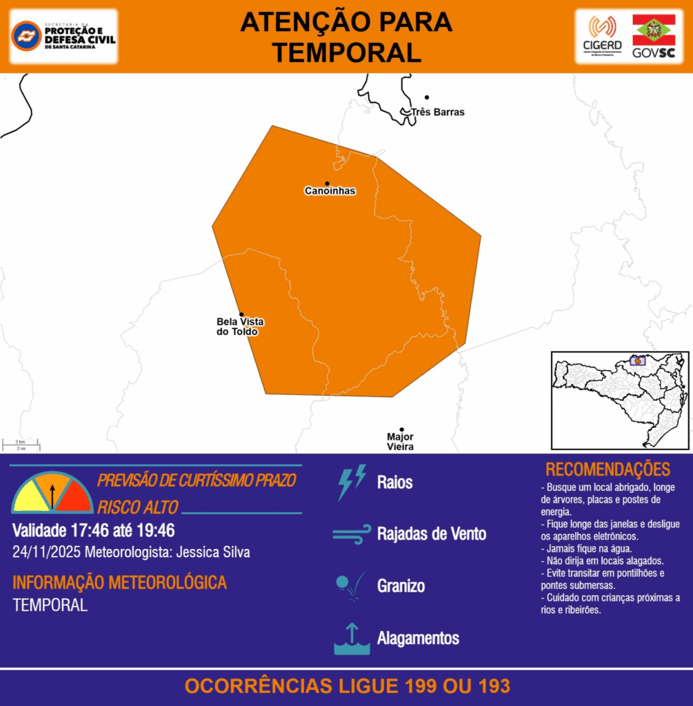 ATENÇÃO – 24/11 17:46 – TEMPORAL com RAIOS, RAJADAS DE VENTO, GRANIZO e ALAGAMENTOS para os municípios de Bela Vista do Toldo, Canoinhas, Major Vieira e Três Barras nas próximas 2 horas. Ocorrências ligue 199 ou 193.