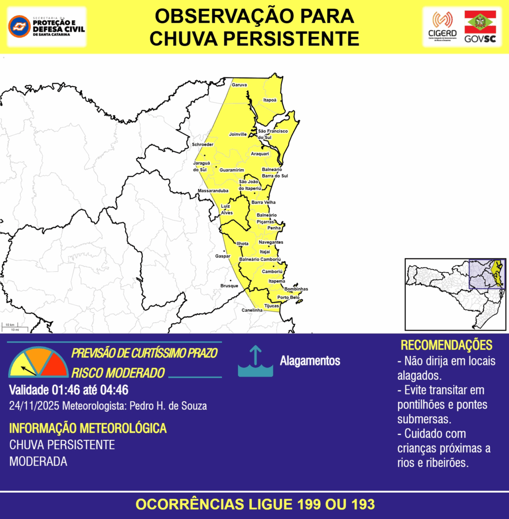 OBSERVAÇÃO – 24/11 01:46 – CHUVA PERSISTENTE de intensidade moderada com ALAGAMENTOS pontuais para as regiões do Litoral Norte, Grande Florianópolis, Baixo e Médio Vale do Itajaí nas próximas 3 horas. Ocorrências ligue 199 ou 193.