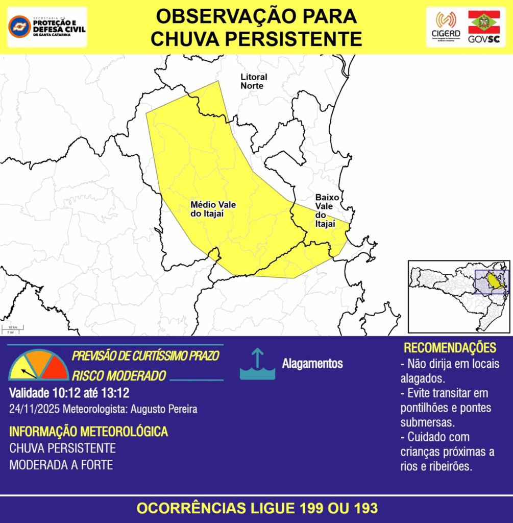 OBSERVAÇÃO – 24/11 10:12 – CHUVA PERSISTENTE de intensidade moderada a forte com ALAGAMENTOS pontuais para as regiões do Litoral Norte, Grande Florianópolis, Baixo e Médio Vale do Itajaí nas próximas 3 horas. Ocorrências ligue 199 ou 193.
