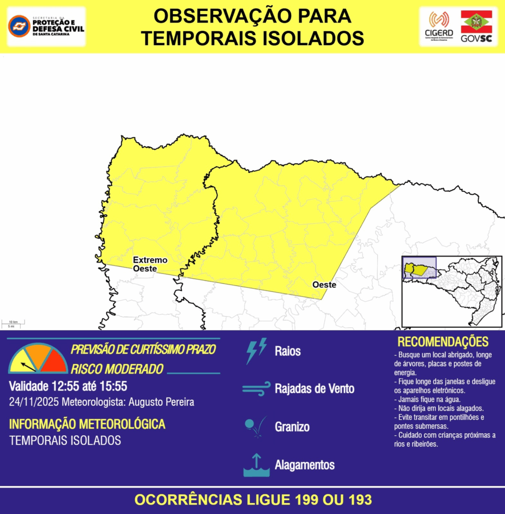 OBSERVAÇÃO – 24/11 12:55 – TEMPORAIS ISOLADOS com RAIOS, RAJADAS DE VENTO, GRANIZO e ALAGAMENTOS pontuais para as regiões do Extremo Oeste e Oeste nas próximas 3 horas. Ocorrências ligue 199 ou 193.