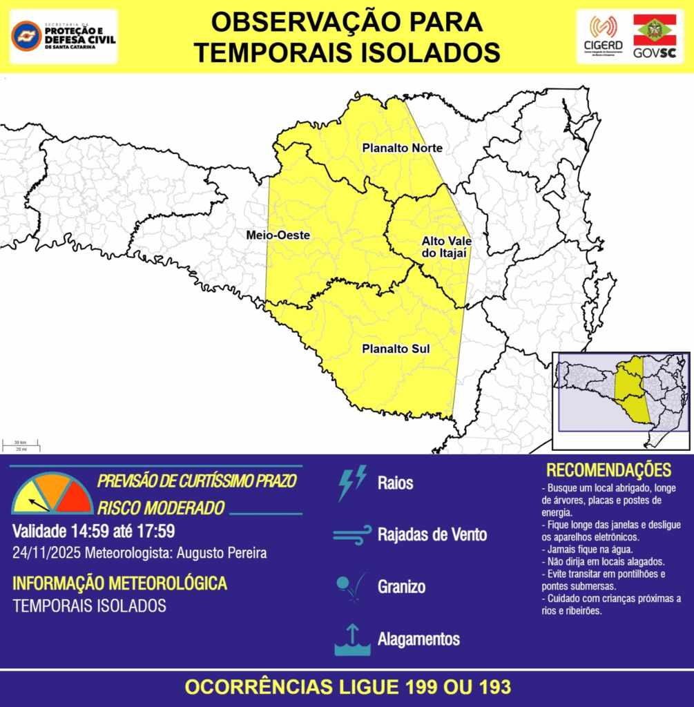 OBSERVAÇÃO – 24/11 14:59 – TEMPORAIS ISOLADOS com RAIOS, RAJADAS DE VENTO, GRANIZO e ALAGAMENTOS pontuais para as regiões do Meio-Oeste, Planalto Norte, Planalto Sul e Alto Vale do Itajaí nas próximas 3 horas. Ocorrências ligue 199 ou 193.