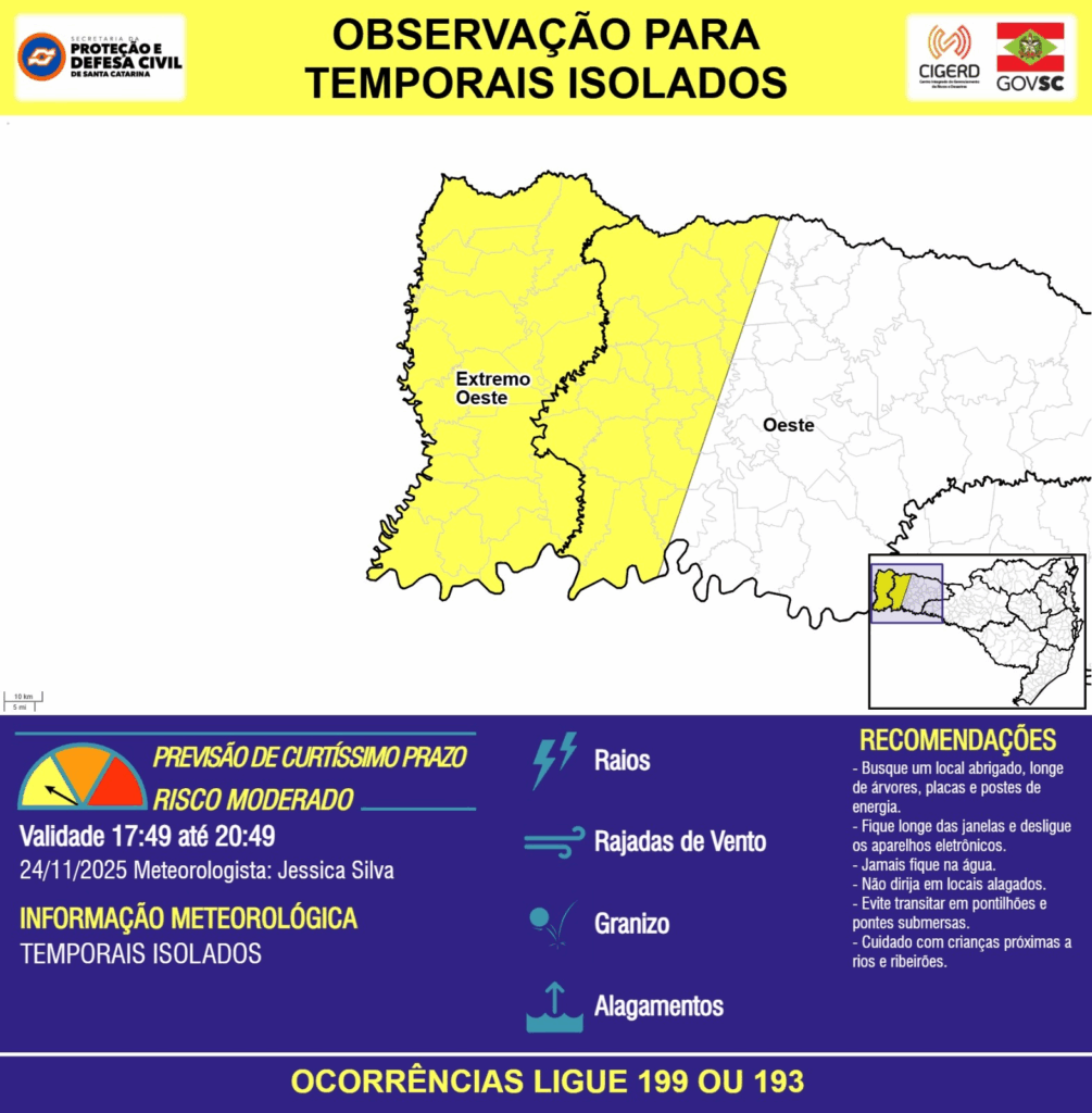 OBSERVAÇÃO – 24/11 17:49 – TEMPORAIS ISOLADOS com RAIOS, RAJADAS DE VENTO, GRANIZO e ALAGAMENTOS pontuais para as regiões do Extremo Oeste e Oeste nas próximas 3 horas. Ocorrências ligue 199 ou 193.
