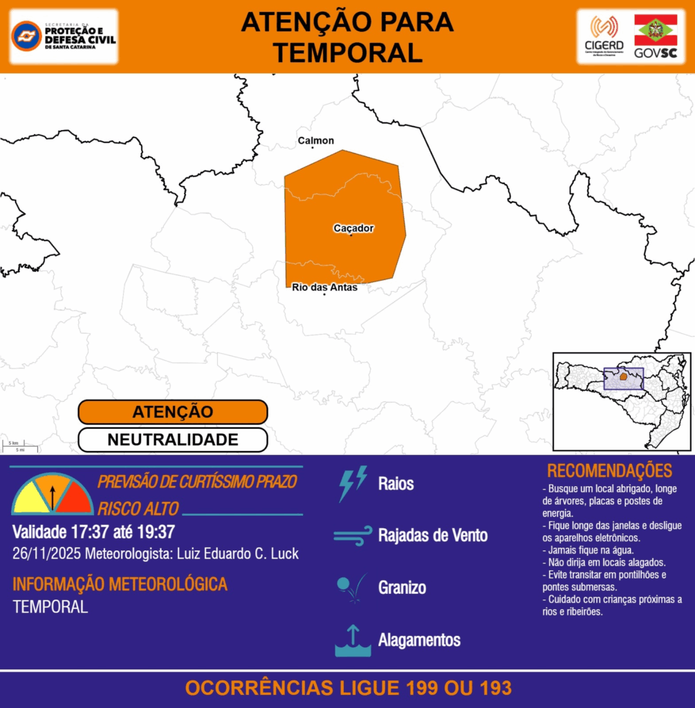 ATENÇÃO – 26/11 17:37 – TEMPORAL com RAIOS, RAJADAS DE VENTO, GRANIZO e ALAGAMENTOS para os municípios de Calmon, Caçador e Rio das Antas nas próximas 2 horas. Ocorrências ligue 199 ou 193.