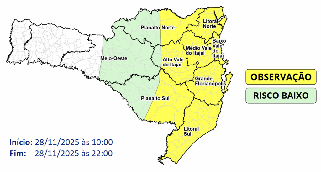 Ao longo do dia de sexta-feira (28), o avanço de uma frentre fria oceânica, somada ao calor e transporte de umidade, favorece condições para temporais acompanhados de raios, rajadas de vento, chuva pontualmente intensa e queda de granizo nos Planaltos, Vale do Itajaí e Litoral. O risco é baixo a moderado para ocorrências relacionadas a destelhamentos, danos na rede elétrica, queda de galhos e árvores, além de alagamentos pontuais.