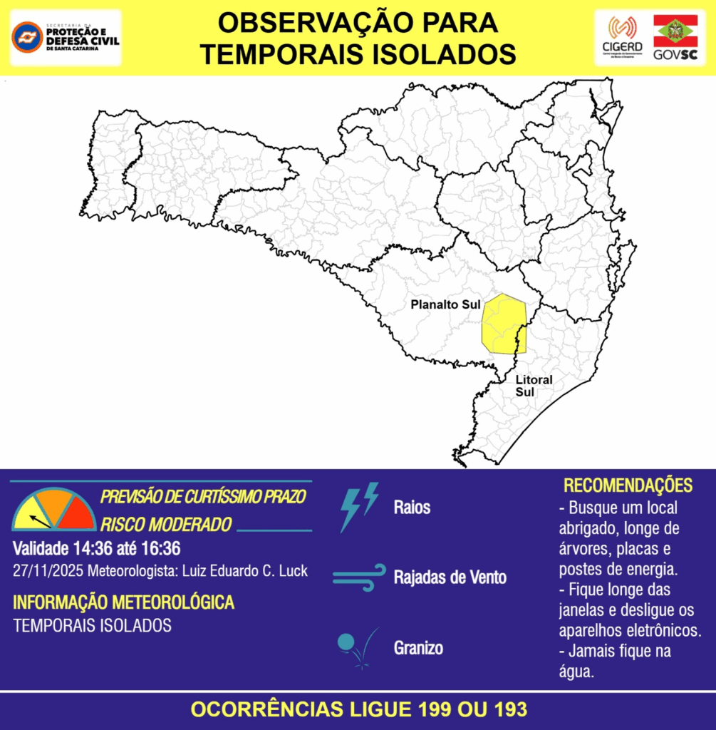 OBSERVAÇÃO – 27/11 14:36 – TEMPORAIS ISOLADOS com RAIOS, RAJADAS DE VENTO e GRANIZO para as regiões do Planalto Sul e Litoral Sul nas próximas 2 horas. Ocorrências ligue 199 ou 193.