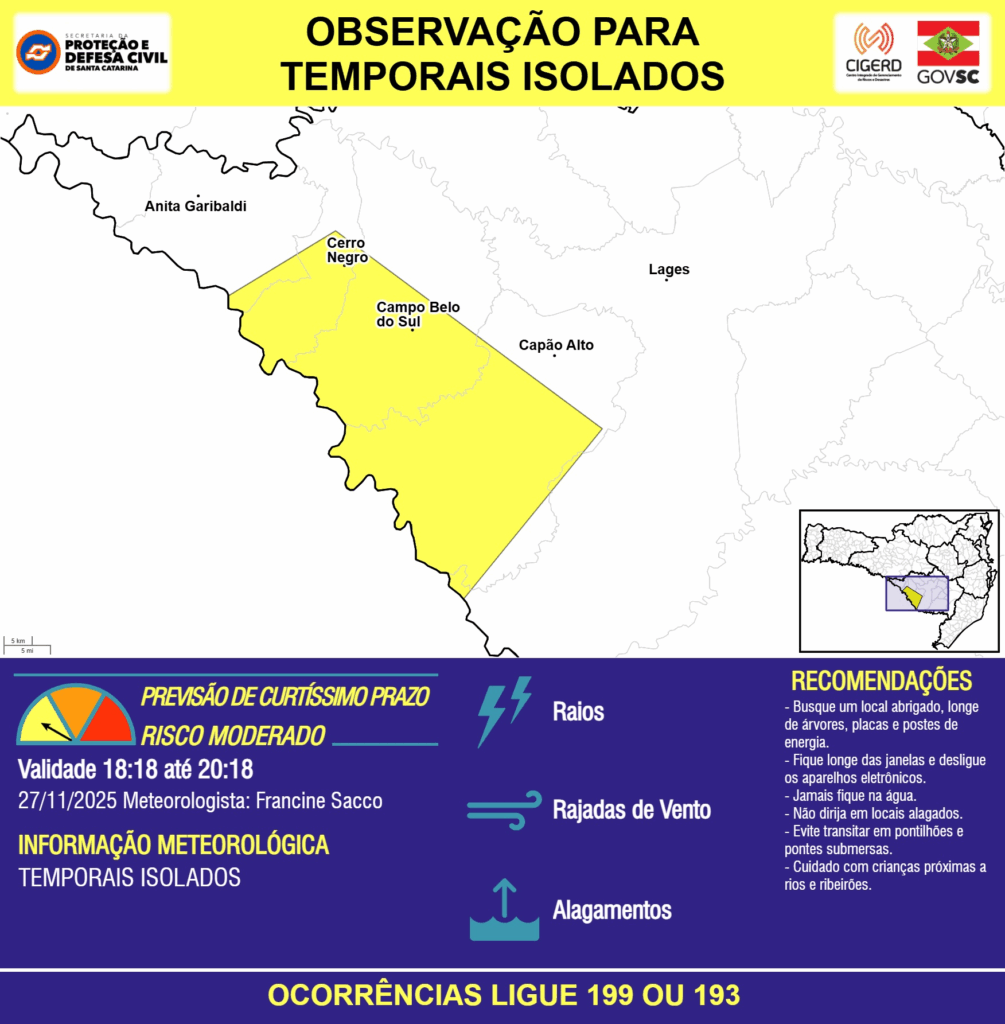 OBSERVAÇÃO – 27/11 18:18 – TEMPORAIS ISOLADOS com RAIOS, RAJADAS DE VENTO e ALAGAMENTOS pontuais para os municípios de Anita Garibaldi, Campo Belo do Sul, Capão Alto, Cerro Negro e Lages nas próximas 2 horas. Ocorrências ligue 199 ou 193.