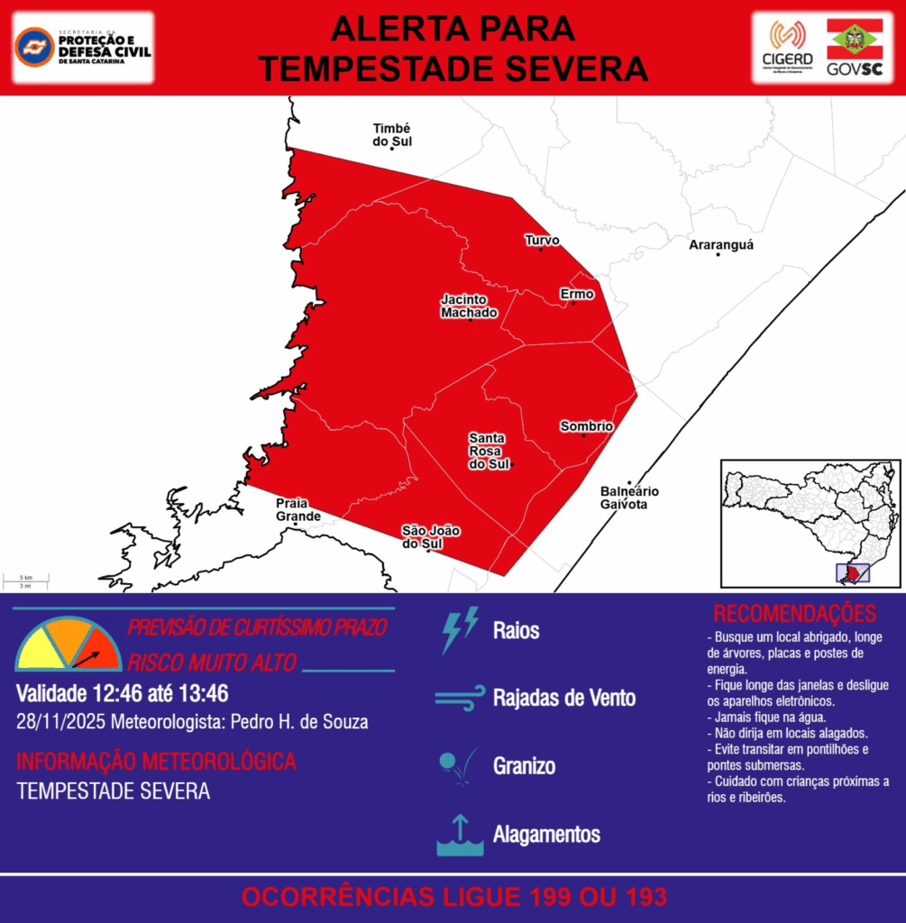 ALERTA – 28/11 12:46 – TEMPESTADE SEVERA com RAIOS, RAJADAS DE VENTO, GRANIZO e ALAGAMENTOS para os municípios de Araranguá, Balneário Gaivota, Ermo, Jacinto Machado, Passo de Torres, Praia Grande, Santa Rosa do Sul, Sombrio, São João do Sul, Timbé do Sul e Turvo na próxima hora. Ocorrências ligue 199 ou 193.