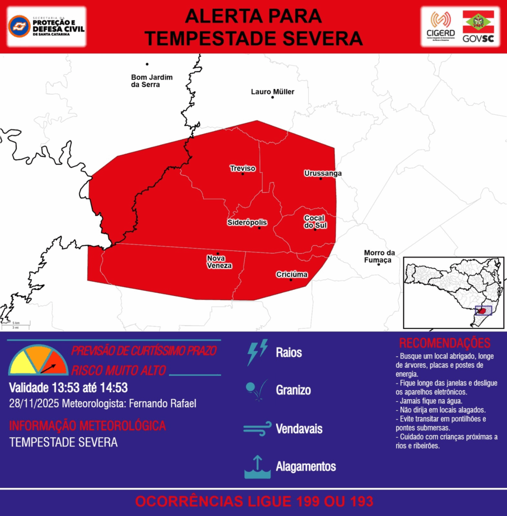 ALERTA – 28/11 13:53 – TEMPESTADE SEVERA com RAIOS, GRANIZO, VENDAVAIS e ALAGAMENTOS para os municípios de Bom Jardim da Serra, Cocal do Sul, Criciúma, Lauro Müller, Morro da Fumaça, Nova Veneza, Siderópolis, Treviso e Urussanga na próxima hora. Ocorrências ligue 199 ou 193.