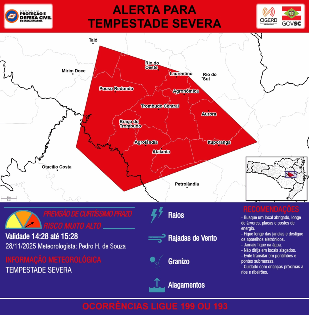 ALERTA – 28/11 14:28 – TEMPESTADE SEVERA com RAIOS, RAJADAS DE VENTO, GRANIZO e ALAGAMENTOS para os municípios de Agrolândia, Agronômica, Atalanta, Aurora, Braço do Trombudo, Ituporanga, Laurentino, Mirim Doce, Otacílio Costa, Petrolândia, Pouso Redondo, Rio do Oeste, Rio do Sul, Taió e Trombudo Central na próxima hora. Ocorrências ligue 199 ou 193.