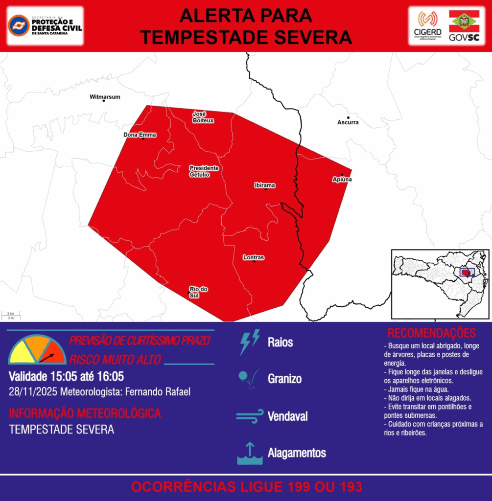 ALERTA – 28/11 15:05 – TEMPESTADE SEVERA com RAIOS, GRANIZO, VENDAVAL e ALAGAMENTOS para os municípios de Apiúna, Ascurra, Dona Emma, Ibirama, José Boiteux, Lontras, Presidente Getúlio, Rio do Sul e Witmarsum na próxima hora. Ocorrências ligue 199 ou 193.
