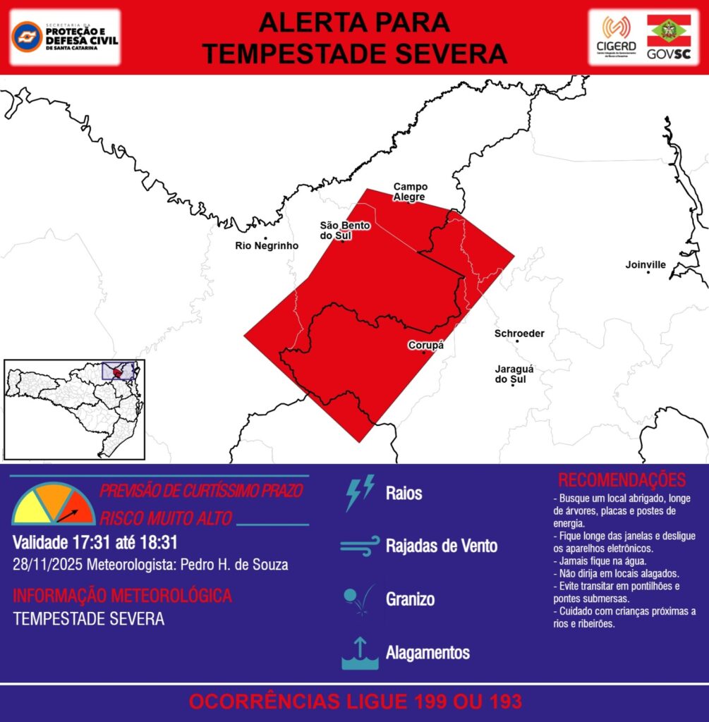 ALERTA – 28/11 17:31 – TEMPESTADE SEVERA com RAIOS, RAJADAS DE VENTO, GRANIZO e ALAGAMENTOS para os municípios de Campo Alegre, Corupá, Jaraguá do Sul, Joinville, Rio Negrinho, Rio dos Cedros, Schroeder e São Bento do Sul na próxima hora. Ocorrências ligue 199 ou 193.