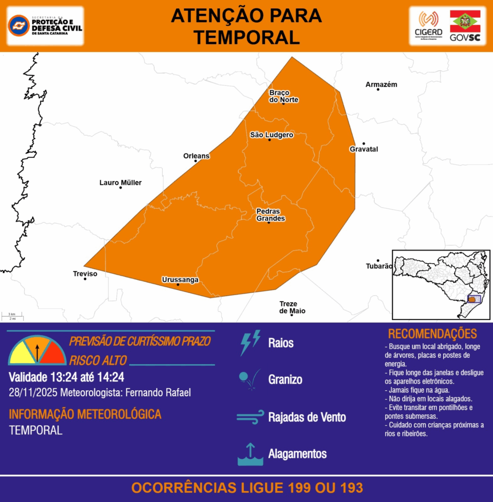 ATENÇÃO – 28/11 13:24 – TEMPORAL com RAIOS, GRANIZO, RAJADAS DE VENTO e ALAGAMENTOS para os municípios de Armazém, Bom Jardim da Serra, Braço do Norte, Gravatal, Grão Pará, Lauro Müller, Orleans, Pedras Grandes, Siderópolis, São Ludgero, Treviso, Treze de Maio, Tubarão e Urussanga na próxima hora. Ocorrências ligue 199 ou 193.